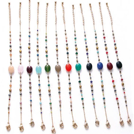 Ketten-Sets mit verschiedenförmig geschliffenen Edelsteinen und ausgewählten Edelsteinsorten, werden in passendem Samtbeutel angeboten und laden zum Wechseln und Anpassen zur jeweiligen Garderobe ein.