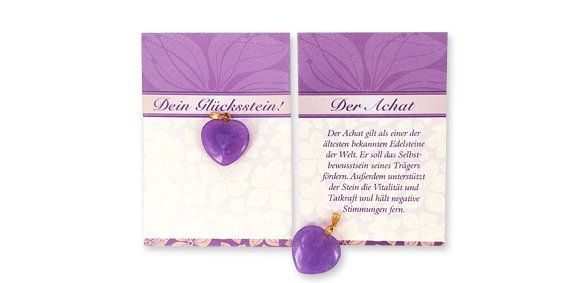 Esto tiene un efecto energético positivo en el cuerpo, la mente y el alma. Por ejemplo, una piedra de adulación de cuarzo rosa, usada cerca del cuerpo, promueve el amor propio, la satisfacción y el bienestar. -El mismo efecto se logra con un corazón de piedras preciosas cortado con amor, colocado como un colgante o una gota de piedra, también provisto de una pequeña tarjeta y presentado en una bonita bolsa de organza. Un colgante de hoja de trébol con una cadena también es un artículo popular.