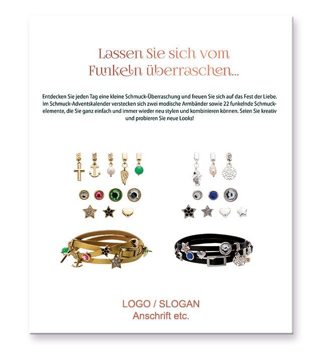 Seien Sie schnell und sichern Sie sich für Ihre Kunden dieses einmalige Angebot ! Adventskalender - ab Lager - lieferbar innerhalb ca. 10 Tagen. Die Adventskalender sind bestückt mit glitzernden Schmuckelementen und zwei Wechselarmbändern.